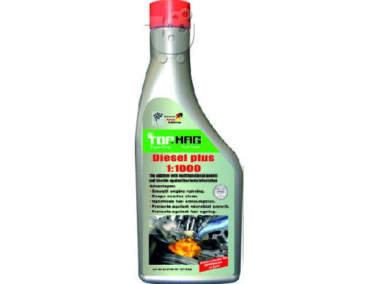Ειδικό πολυλειτουργικό πρόσθετο πετρελαίου με αντιβακτηριακή προστασία κατά της μυκητολάσπης...\r\nΜε πολλαπλά ενεργά συστατικά \r\nΣυνιστάται ανεπιφύλακτα για DIESEL καύσιμα με BIO-DIESEL έως 20 % .\r\nΜε αντιβακτηριακά πρόσθετα.- βελτιωτικό κετανίων επιτυγχάνοντας άμεση βελτίωση της συμπεριφοράς ανάφλεξης.– Σταθεροποιητής καυσίμου. Μειώνει την κατανάλωση καυσίμων.\r\nΕΠΙΔΡΑΣΗ\r\nΗ κυμαινόμενη ποιότητα του καυσίμου επηρεάζει την απόδοση του κινητήρα και την κατανάλωση\r\nΟι καταθέσεις στα μπεκ αυξάνουν την κατανάλωση των καυσίμων.\r\nΣτο πετρέλαιο μπορούν να αναπτυχθούν βακτηρίδια και να οδηγήσουν σε απόφραξη των φίλτρων, δημιουργία λάσπης και διάβρωσης.\r\nΤο TOP-MAG DIESEL PLUS 1:1000 διατηρεί την δεξαμενή του καυσίμου καθαρή απαλλαγμένη από βακτήρια και μύκητες καίγοντας τα και εμποδίζει την επαναδημιουργία τους.\r\nΠΛΕΟΝΕΚΤΗΜΑΤΑ\r\n• Ισχυρή αντιβακτηριακή προστασία κατά της μυκητολάσπης.\r\n• Βελτιωτικό κετανίων <αύξηση έως και 3 μονάδες.>!!! \r\n• Για πετρέλαιο με περιεκτικότητα σε Bio-diesel έως 20%\r\n• Με αντιβακτηριακά πρόσθετα κατά βακτηρίων και μυκητών στο πετρέλαιο. \r\n• Καθαρίζει τα μπέκ ψεκασμού. \r\n• Δεν αφήνει κατάλοιπα..\r\n• Μειώνει την κατανάλωση καυσίμων. \r\n• Προσφέρει καθαρή καύση και μείωση των εκπομπών καυσαερίου. \r\n• Εύκολη εκκίνηση σε χαμηλές θερμοκρασίες. \r\n• Αυξάνει την ισχύ του κινητήρα \r\n• Σταματά το κάπνισμα του κινητήρα.\r\n• Καθαρίζει και διατηρεί καθαρό το κύκλωμα καυσίμου .\r\n• Προστατεύει από την διάβρωση το ρεζερβουάρ και το χώρο καύσης στο εσωτερικό του κινητήρα.\r\n• Άμεσα αποτελέσματα. Ανακουφίζει το φίλτρο σωματιδίων αιθάλης < DPF>\r\n\r\nΧΡΗΣΗ\r\n250 ml αρκούν για 250 λίτρα πετρελαίου με ενσωματωμένο δοσομετρητή. Διατίθεται και σε οικονομική συσκευασία \r\n1 λίτρο για 1000 λίτρα πετρελαίου. Συμπυκνωμένο προιόν. \r\nΠιστοποιημένο Γερμανικό προιόν με . DIN ISO 9001.2008\r\nΕπιβάλεται η χρήση του για τροχοφόρα και σκάφη πού χρησιμοποιούν πετρέλαιο, ειδικά τα εποχιακής λειτουργίας ή όταν σταματάει η λειτουργία τους πάνω από 40 μέρες διότι το πετρέλαιο δημιουργεί μύκητες που βουλώνουν φίλτρα –μπέκ κ.λ.π.\r\nTό TOP-MAG DIESEL PLUS 1:1000 είναι για τακτική χρήση και για όλες τις ποιότητες καυσίμων DIESEL και BIODIESEL εως 20%. \r\n\r\nΑΠΟΚΛΕΙΣΤΙΚΗ ΔΙΑΘΕΣΗ