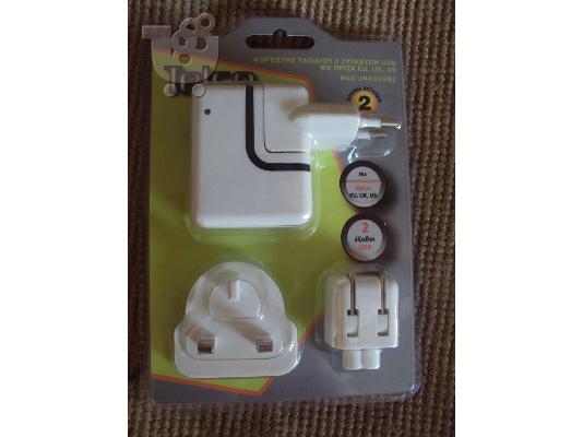 φορτιστής ταξιδιού 2 συσκευών USB με μπριζα EU,UK,US.
