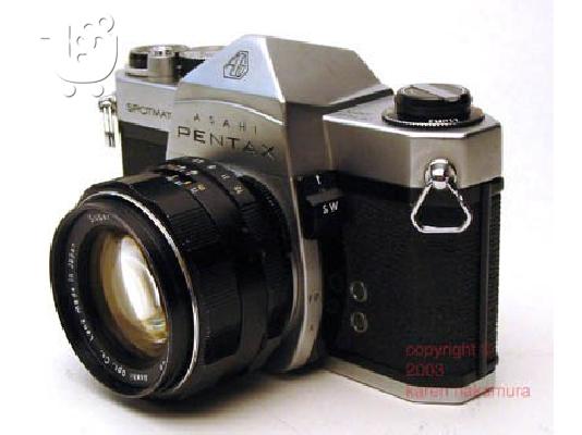 μαρκας Asahi Pentax, αναλογικη, μοντελο Spotmatic του 1969, συλλεκτικο κομματι. Περιλαμβανει το σωμα της μηχανης + 1 φακο Takumar 1:1,4/50 + 1 τηλεφακο Photax 1:4/300 + 1 converter 2X + 1 Proxiwide + 2 flash + 4 φιλτρα + βαλιτσακι μεταφορας