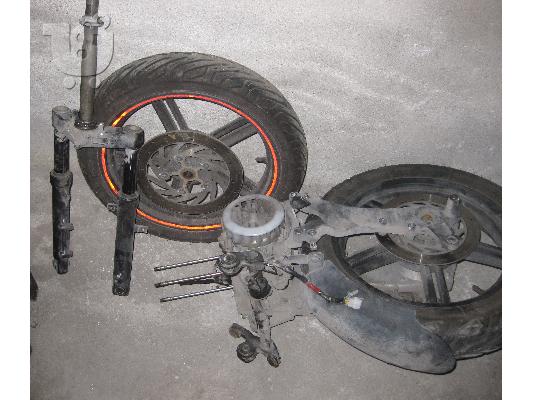 Πωλούνται διάφορα μέρη από Kymco Agility 150cc. Το μηχανάκι είχε σπασμένο τιμόνι και το αγόρασα ολόκληρο για να πάρω το μοτέρ να το βάλω σε ένα άλλο. Τα μέρη που πουλάω είναι σε πολύ καλή κατάσταση. Συγκεκριμένα: Ρόδες, πηρούνα ανάρτησης, εξάτμιση, σέλα, πίσω και μπρος φανάρι, πλαστικά, πλεξούδα, συναγερμός κ.ά. Μπορείτε να τα δείτε από κοντά. Απευθύνομαι τόσο σε ιδιώτες όσο και σε συνεργεία. Πωλούνται είτε μεμονωμένα είτε όλα μαζί (σε καλύτερη τιμή αν είναι όλα μαζί).