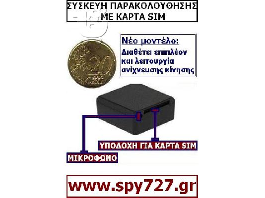 Η μικρότερη εξελιγμένη συσκευή παρακολούθησης! Βάλτε της μια οποιαδήποτε κάρτα SIM, αφήστε τη στον χώρο που θέλετε να παρακολουθήσετε, καλέστε όπου και να βρίσκεστε από κινητό ή σταθερό τηλέφωνο τον αριθμό της κάρτας που έχετε βάλει στην συσκευή και ΑΚΟΥΣΤΕ ΤΑ ΟΛΑ. Για να δείτε την ΤΙΜΗ επισκεφθείτε την ιστοσελίδα: www.spy727.gr