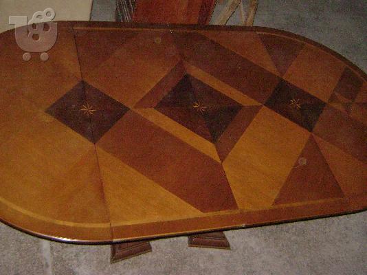 Τραπεζαρία Super μεγάλη πωλείται από ξύλο μασίφ, με μαρκετερί και οκτώ καρέκλες. Διαστάσεις : κλειστή (στρόγγυλη) Φ 120 Χ 78 ύψος Ανοιχτή με ένα φύλλο (οβάλ) 170Χ120Χ78 Ανοιχτή με δύο φύλλα (οβάλ) 220Χ120Χ78 Διαστάσεις βάσης 64Χ64 Σε άριστη κατάσταση.