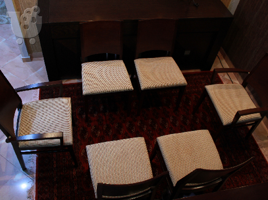 Πωλείται τραπεζαρία με 6 καρέκλες, μπουφές, συρεταριέρα και καθρέφτης από φυσικό ξύλο απόχρωσης wenge (βέγγε). Διαστάσεις τραπεζιού (μηκ Χ πλ Χ υψ) 170cm X 90cm X 83cm διαθέτει κρυφό πρόσθετο 68cm / διαστ. μπουφέ (πλ Χ υψ Χ βάθος) 207cm X 86cm X 50cm (διαθέτει και 3 συρτάρια πάνω από τα ντουλάπια) / διαστ. συρταριέρας (πλ Χ υψ Χ βαθ) 120cm X 80cm X 40cm / διαστ. καθρέφτη 90cm X 90cm.